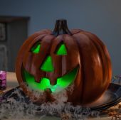 Halloween Græskar Røgmaskine med uhyggelige lydeffekter fx spøgelses latter og grin kombineret med røg og LED lyseffekter. Inkl. Trådløs fjernbetjening og 5 liter røgvæske. Set consisting of: 1 x S553L Smoke Machine 3 LEDs RGB Read more 1 x Pumpkin Head Read more 1 x FSMF5E-G Smoke Fluid 5L Standard Green Read more