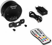 | Product colour | Black | | Light source | 4-in-1 LED | | Colours | Red, Green, Blue, White | | LED power (single LED) | 8W | | Quantity of LEDs | 1 | | Flash rate per second | 1 - 19Hz | | DMX connection | Wireless DMX | | Modes | Automatic programs, Manual | | IP rating | IP20 | | Cooling | Convection | | Power plug | External power supply | | Battery | 3.7V - 5Ah | | Power supply | 100-240VAC 50/60Hz (5V Adapter) | | Dimensions (L x W x H) | 95 x 95 x 85mm | | Weight (kg) | 0,42 | | Included accessories | Remote control (wireless), Power adapter | pdf