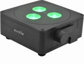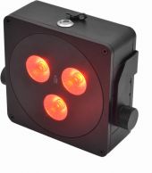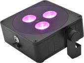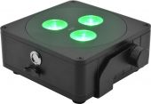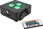 | Power supply: | 100-240 V AC, 50/60 Hz 12.6V DC 2500 mA | | IP classification: | IP65 | | Protection class: | Protection class III | | Power connection: | Mains input via coaxial power connector (M) mounting version power supply cord with Euro plug (provided) Battery/battery pack | | Battery pack type: | 2 x lithium ion 11.1 V, 2600 mAh, 28.86 Wh | | Battery pack: | Battery operation up to 16h depending on program used Recharging time 4h | | Lamp type: | LED lamp | | LED type: | 3 x 8 W SMD 9080 4in1 QCL RGBW (homogenous color mix) | | Flash rate: | 1 - 23 Hz | | DMX channels: | 3; 4; 6; 8; 10 | | Cooling: | Passive convection cooling | | Control: | Master/slave function; IR remote control; QuickDMX; stand-alone; sound to light via microphone | | Preprogrammed in: | Light´J; Light Captain; EASY SHOW 1; EASY SHOW 2; EASY SHOW 3; Colorchief | | Projection: | Flicker-free | | Carrier frequency: | 2.4 GHz | | Beam angle: | 15° | | Beam angle (1/2 peak): | 15° | | Beam angle (1/10 peak): | 33° | | Housing color: | Black | | Attachment system: | Mounting bracket | | Display type: | LCD display | | Dimensions: | Width: 17.2 cm Depth: 13.8 cm Height: 6.2 cm | | Weight: | 1.61 kg | | Noise classification: | Class 0 (no noise at all) | | Remote control | | | Battery: | 1 x button cell 3.0 V CR2032 lithium manganese built-in | | Legal specifications | | | Special product: | Not designed for household room illumination | | Intended use: | Show effect lighting |