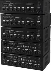| Power supply: | 100-240 V AC, 50/60 Hz Or 24V | | Power consumption: | 120 W | | Protection class: | Protection class I | | Output power: | 60 W RMS | | Power connection: | Mains input via IEC connector (M) mounting version power supply cord with safety plug (provided) Battery/battery pack (not included) | | Battery: | 1 x button cell 3.0 V CR2025 lithium manganese built-in | | Impedance: | Public address systems 100V; Public address systems 70V; 4-16 ohms | | Control: | Bluetooth; IR remote control | | Audio player: | USB + SD + Bluetooth + FM radio | | Zone output: | 4 switchable zones | | Circuitry: | Class D | | Controls: | Overload; short-circuit; limiter; overheat | | Connections: | Input: microphone via 1 x 3-pin XLR Input: mic/line via 2 x 6.3 mm jack socket (stereo) mounting version Input: line via 2 x stereo RCA Output: line via 1 x stereo RCA 0.774 V Output: speaker via screw terminal | | Equalizer: | Master: 1 x 2-band tone control | | Music format: | MP3 | | Housing design: | 2 U Desktop console housing | | Dimensions: | Width: 30.3 cm Depth: 22 cm Height: 9.1 cm | | Weight: | 3.60 kg |