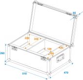 |  | Trunk case | Aluminum profile frames: | 30 mm | | Case handle: | 2 pc/pcs | | Stop hinge: | 2 pc/pcs | | Lock: | Butterfly lock: 2 pc/pcs | | Transport aid: | 4 x rubber feet | | Material: | Plywood multi-layer glued, 9 mm | | Color: | Black, laminated | | Inside dimensions: | 46 cm x 42 cm x 29 cm | | Device compartment: | 12 cm x 35 cm x 29 cm | | Accessory compartment: | 10 cm x 42 cm x 29 cm | | Dimensions: | Width: 51 cm Depth: 47 cm Height: 34.5 cm | | Weight: | 9.90 kg |     |  |  |  | |