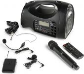 |  | The ST016 is a light and compact portable PA amplifier equipped with a UHF wireless microphone system, consisting of a headset and handheld microphone. The speaker has a built-in high-capacity Li-ion rechargeable battery, suitable for outdoor activities where there's no access to a wall outlet. In addition, the ST016 is packed with other functions; there’s a fully-featured built-in music player with USB port, SD card reader, FM tuner and BT 5.0 streaming. (up to 20 meters range) The large LCD screen and the torch function make this device complete. Suitable for in and outdoor applications such as teaching, fitness, conference, sales promotion, tour guide etc, everywhere you need to raise your voice. - Portable wireless PA amplifier system