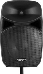 |  | The VPS152A is a complete plug & play set, ready to start your party. The set contains a pair of 15" speakers, a passive and an active model. The active model houses the amplifier which has a built-in USB/SD player and BT wireless technology to stream your music from your smartphone or tablet. Both speakers have a blue LED ring around the woofer to colourize and illuminate your party. Completing the kit is a wired microphone for karaoke or presentation purposes. - 1000W speaker set with stands