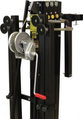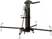 | Maximum carrying capacity: | 220 kg | | Minimum load: | 40 kg | | Nominal tensile strenght of rope: | 1770 N/mm² | | Height: | Maximum: 500 cm above 4 sections Minimum: 157 cm | | Steel rope: | Ø 6 mm | | Type (general stands): | Truss lifter | | Material: | Steel (powder-coated) | | Transport dimensions: | 155 cm x 60 cm x 55 cm | | Base area: | Ø 220 cm | | Weight: | 101.00 kg |     |