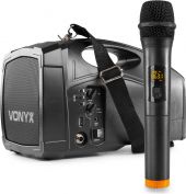 |  | Vonyx ST014 er et smart og enkelt bærbart PA-system med en trådløs håndholdt mikrofon, der blandt andet er optimalt til brug af tour-guides og lignende. Systemet er nemlig med indbygget batteri og kan derfor bruges overalt. Men ST014 er mere end bare et bærbart PA-system. Det indbyggede Bluetooth-modul gør det muligt at holde systemet helt trådløst. For med Bluetooth kan der oprettes trådløs forbindelse til telefon, tablet eller laptop. Musik afspillet på den forbundne enhed vil herefter blive afspillet på den bærbare højttaler. Sammen med den medfølgende trådløse mikrofon og det indbyggede batteri gør alt dette ST014 til et fuldt udbygget trådløst system. - USB-indgang til afspilning af MP3-filer