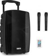 |  | Med Vonyx VSP200 får du et transportabel lydsystem i en rigtig god kavlitet. der løfter din lydoplevelse til nye højder. Udover en indbygget kraftig 2 delt forstærkerenhed har VSP200 også Bluetooth modtager, så du nemt kan steame dit yndlingsmusik fra enhver smartphone eller tablet. Derudover har dette system en brugervenlig USB-indgang og SD-kortlæser, så MP3 musik kan afspilles ubesværet. Og Vonyx VSP200 genopladelige batteri gør dette system perfekt til adskillige anvendelser såsom PA-brug og gadeoptrædener. De to inkluderede UHF-mikrofoner giver dig fuld frihed på scenen. Bagsiden af dette lydsystem garanterer forbindelse, alsidighed og funktionalitet. To mikrofonforbindelser med en 3-pin XLR combo-input er tilgængelige for at imødekomme alle mikrofonbehov. Derudover er en Aux line-indgang tilgængelig til tilslutning af eksterne lydkilder som f.eks. en smartphone eller en bærbar computer. MP3-styringsenheden forenkler navigationen gennem din musikbibliotek, mens en batteriindikatorsektion gør det let at kontrollere batteriets status. For ekstra bekvemmelighed under transport er dette system indkapslet i et robust kabinet, komplet med hjul og et træk-ud håndtag. - Alt-i-et bærbart lydsystem