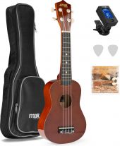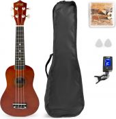 Vare sæt - pakketilbud nr. 10100746 Tilbudet indeholder følgende: 1 x Ukulele Pakke med taske, digital-tuner, plektre og ekstra strengesæt, Mørk træ