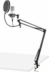 The CM300 USB microphone Set contains a high performance condenser microphone with a wide frequency response specially designed for free drive and simple operation. It connects directly to a PC or laptop using a contemporary USB cable and is immediately ready to use in a plug and play style. The sturdy metal suspension scissor stand with table mount clamp guarantees an excellent range of motion. Widely used for singing, gaming, chatting, web hosting, personal recording, podcasting, video voiceovers, Skype conferences and many other applications.