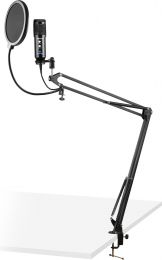 |  | OBS: Vi har kun 5 stk. af denne vare. The CMS320 Set contains a high performance condenser microphone together with a adjustable suspension scissor arm stand and a pop filter on gooseneck. The studio microphone is equipped with a 3.5mm headphone jack that allows you to listen to what you are recording in real time, and the volume and echo controls give you the ability to make the perfect recording. Widely used for singing, gaming, chatting, web hosting, personal recording, podcasting, video voiceovers, Skype conferences and many other applications. Simply connect directly to a PC or laptop using the included USB cable and it's ready to use in a plug and play style. - Condenser microphone with USB output