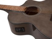 Mini jumbo western guitar with pickup system | Battery: | 1 x 9.0 V E block 6F22 zinc carbon built-in | | Version: | Right hand version | | Neck: | Mahogany, Fingerboard: Blackwood 20 frets | | Body: | 4/4 mini jumbo-form Mahogany painted | | Scale length: | 650 mm | | Nut width: | 43 mm | | Bridge: | Rosewood | | Number of strings: | 6 | | Top: | Spruce massive | | Color: | Nature, high-gloss, painted | | Weight: | 2.20 kg |     |